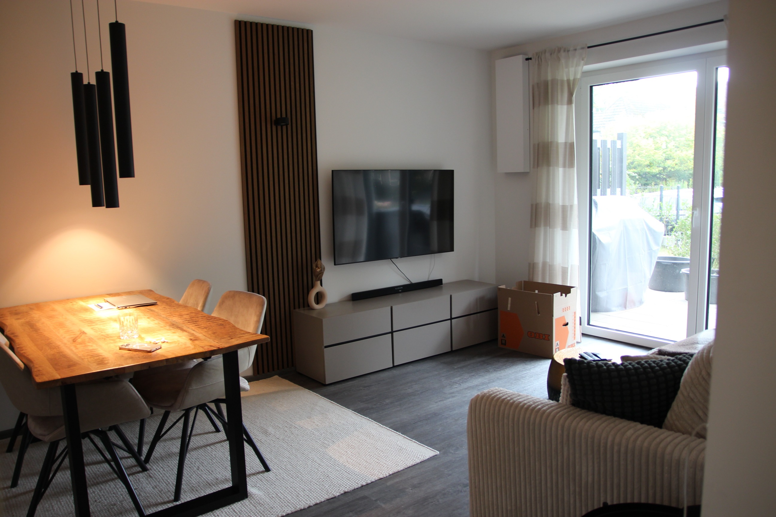 Entspannen Sie in den charmant geplanten Wohn- und Küchenbereich mit Zugang zur Terrasse und Ihrem Privatgarten (ca. 110,40 qm) in Süd / West Ausrichtung