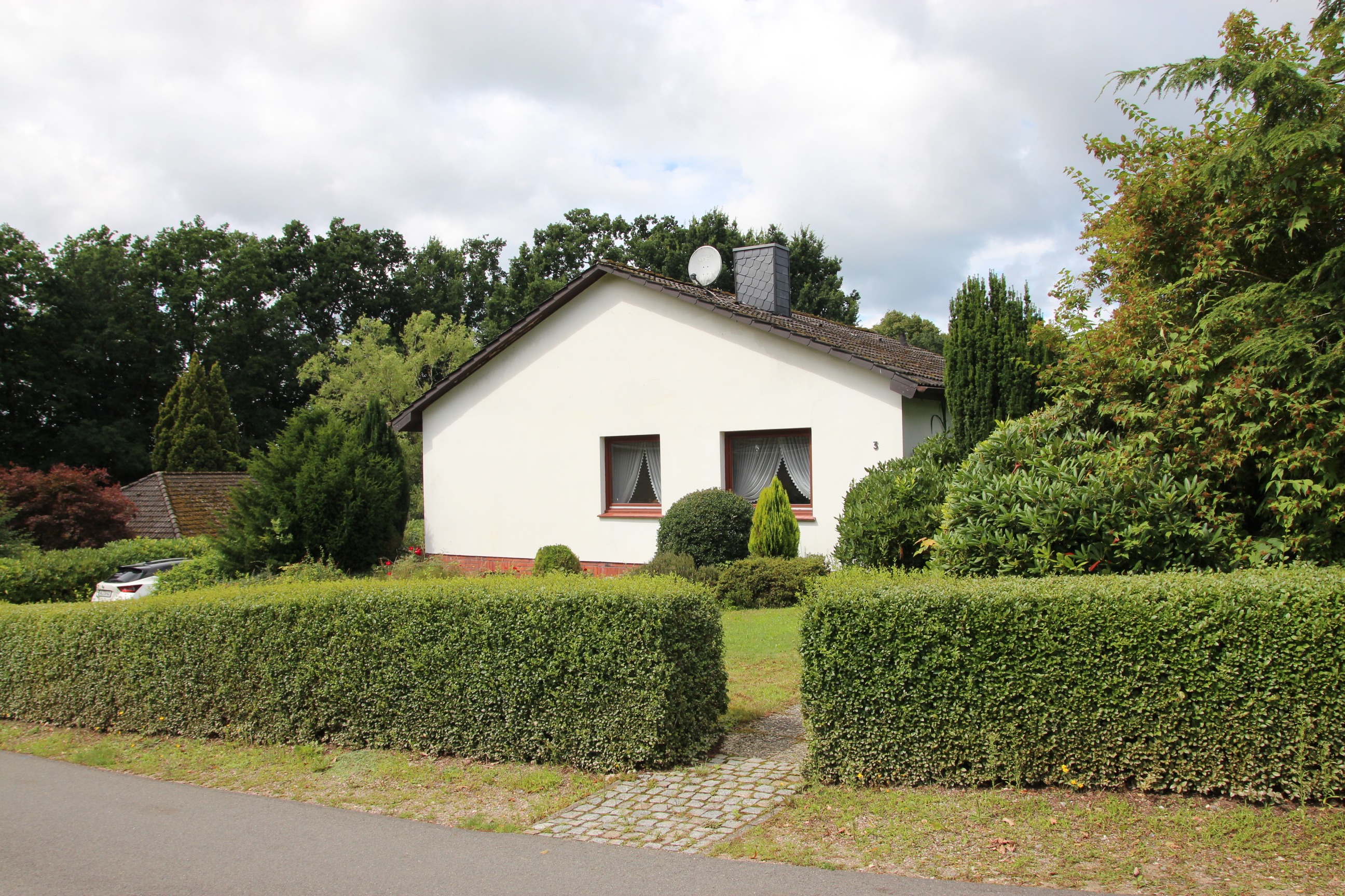 Zum Verkauf steht das weiß verputzte, voll unterkellerte Massivhaus. Gelegen in einer ruhigen Anliegerstraße bietet es Ihnen die Ruhe und Erholung, die jeder sich wünscht. Das schwarze Satteldach unterstreicht den klassischen Charakter des Gebäudes.