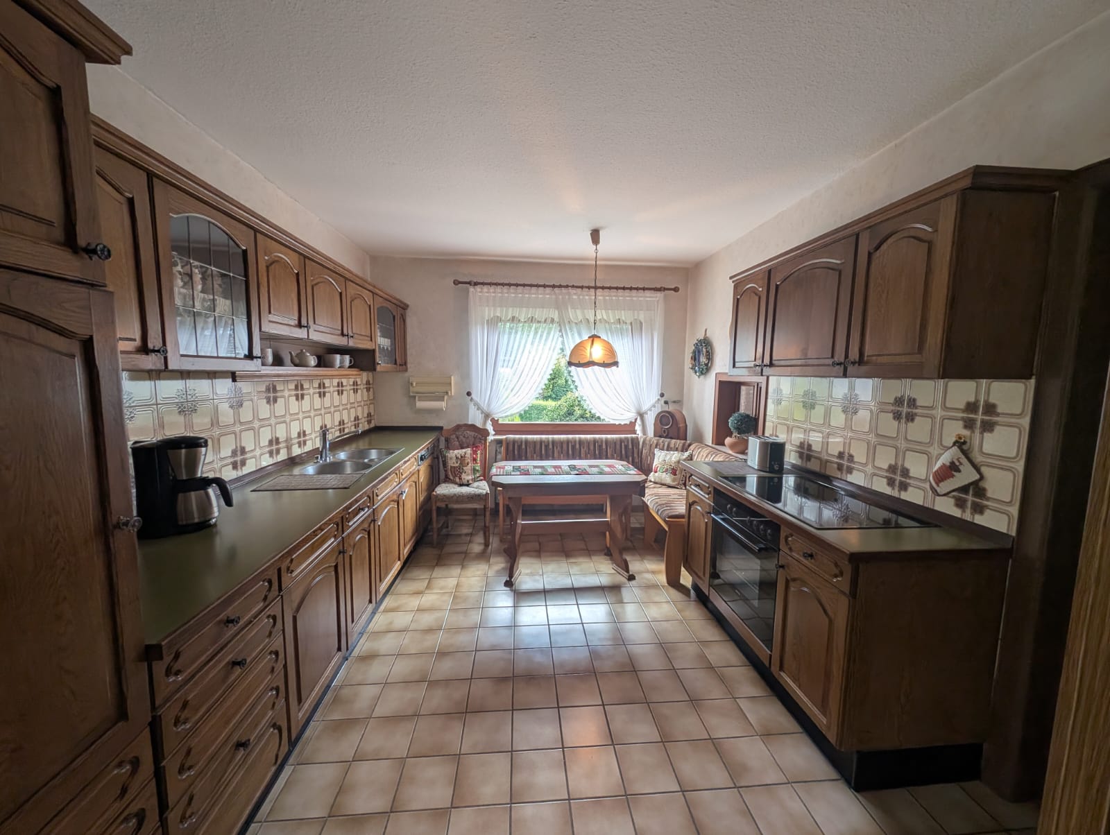 Die Vollholzküche lädt zu einem gemütlichen Frühstück ein und bietet zugleich einen freien Blick in den Vorgarten
